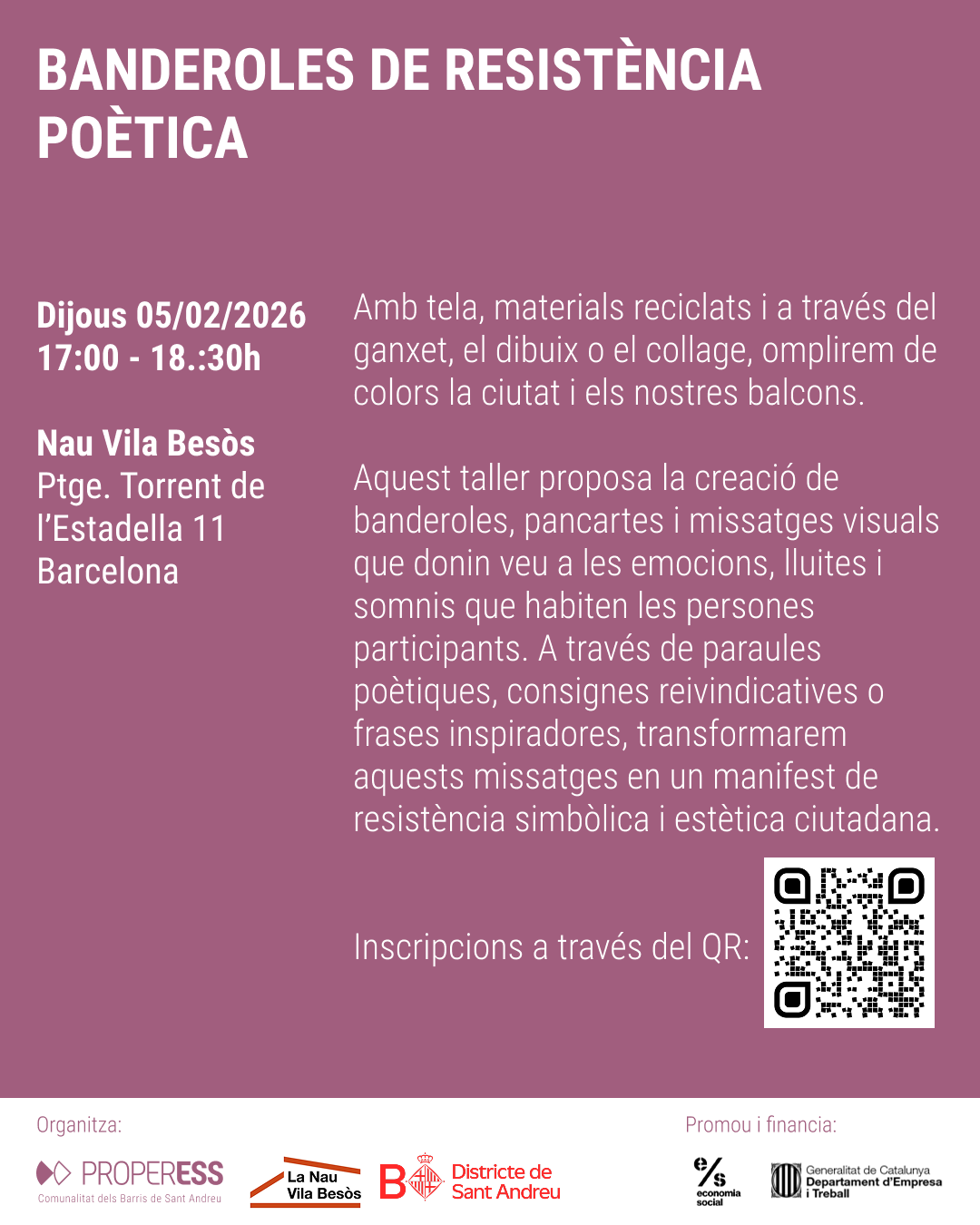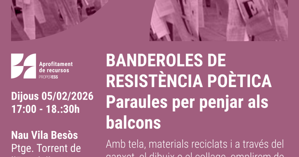 Aquest taller proposa la creació de banderoles, pancartes i missatges visuals que donin veu a les emocions, lluites i somnis que habiten les persones participants. A través de paraules poètiques, consignes reivindicatives o frases inspiradores, transformarem aquests missatges en un manifest de resistència simbòlica i estètica ciutadana.